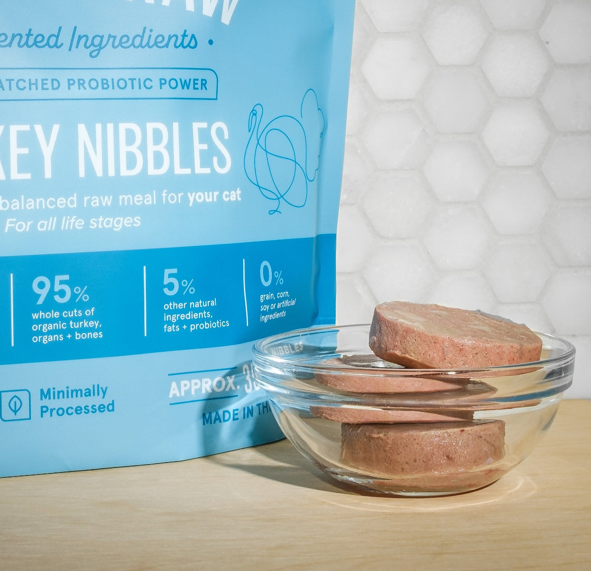 of wholefoods specially crafted to meet and exceed your cat’s daily nutritional needs. Our high-quality ingredients include whole cuts of organic poultry along with fermented organic vegetables, duck eggs, cod liver, and fermented raw whey.